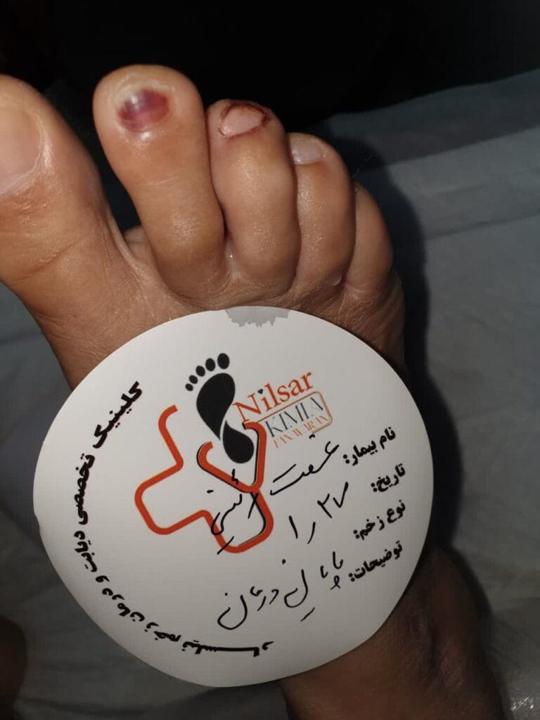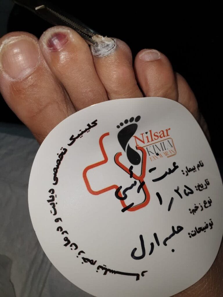 بیمار خانم ۶۵ ساله دیابتی هستن ک در اثر پوشیدن کفش نامناسب ناخن پاشون نکروز شده بعد از برداشتن ناخن و استفاده از پانسمان سلول بنیادی زخم بعد از یک جلسه ترمیم شد .